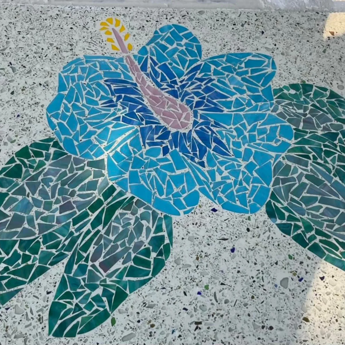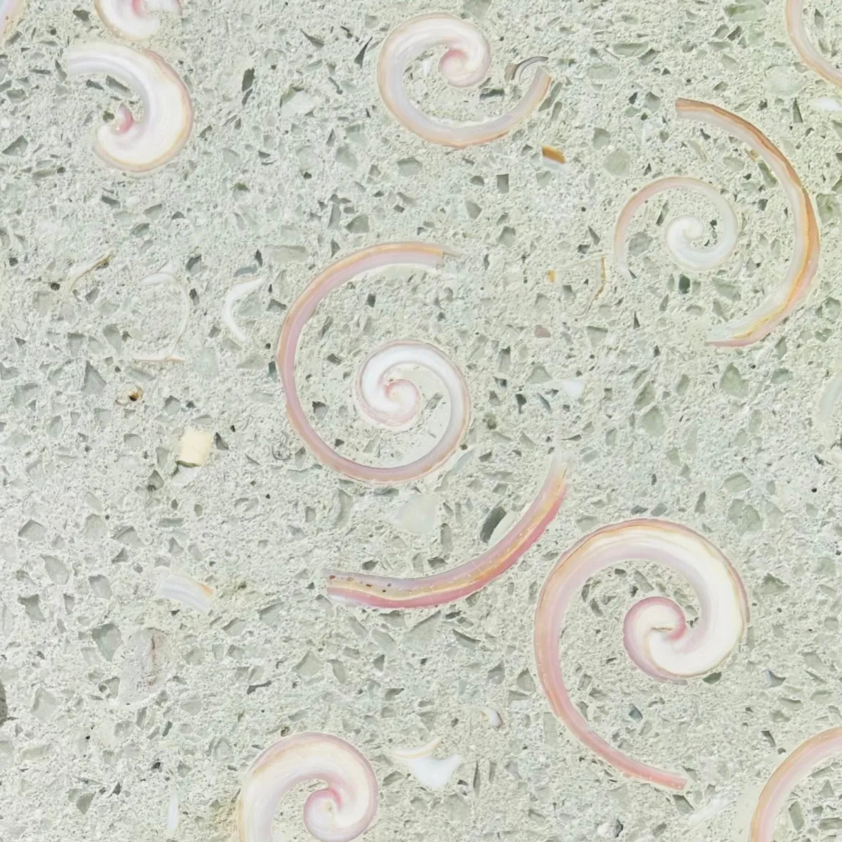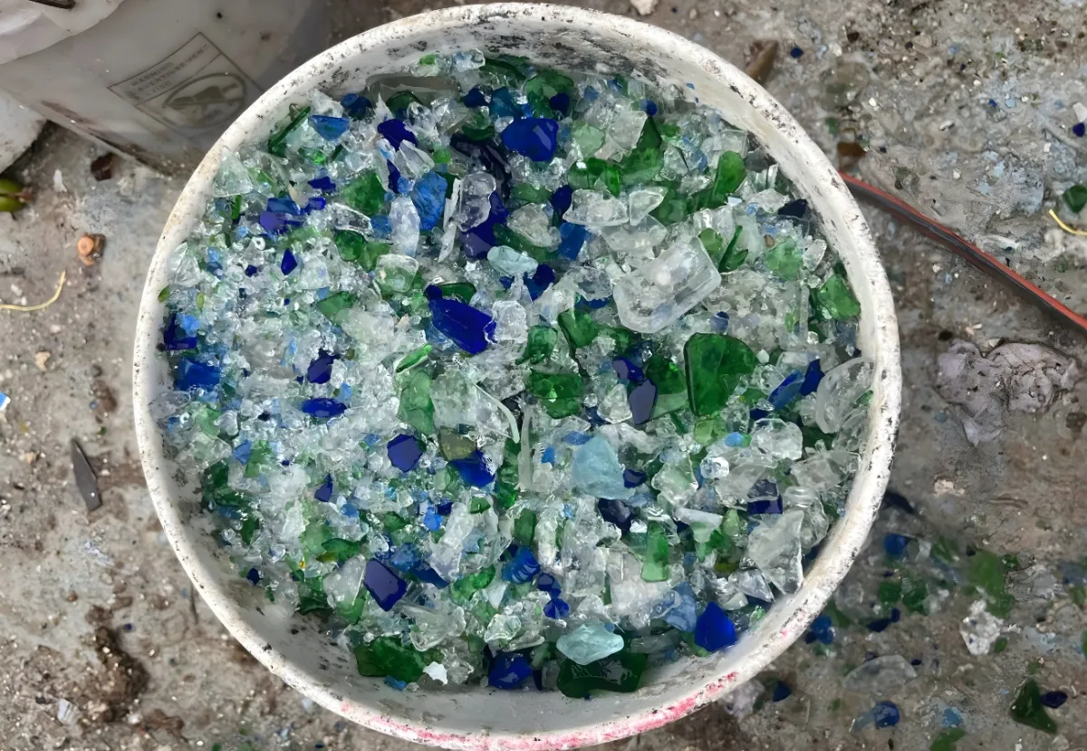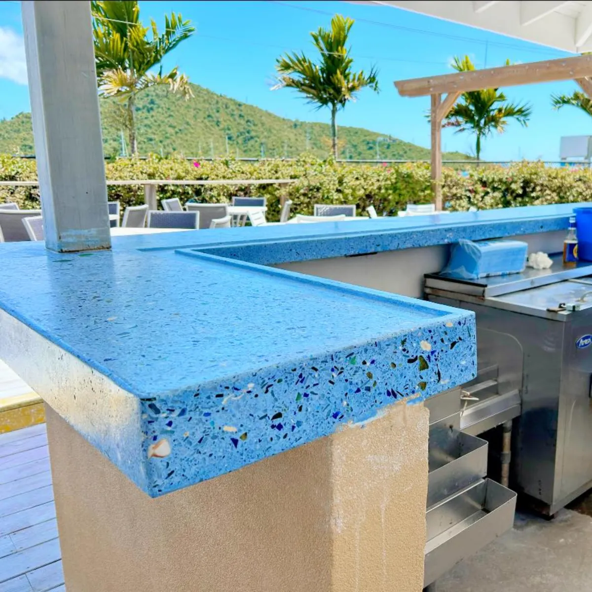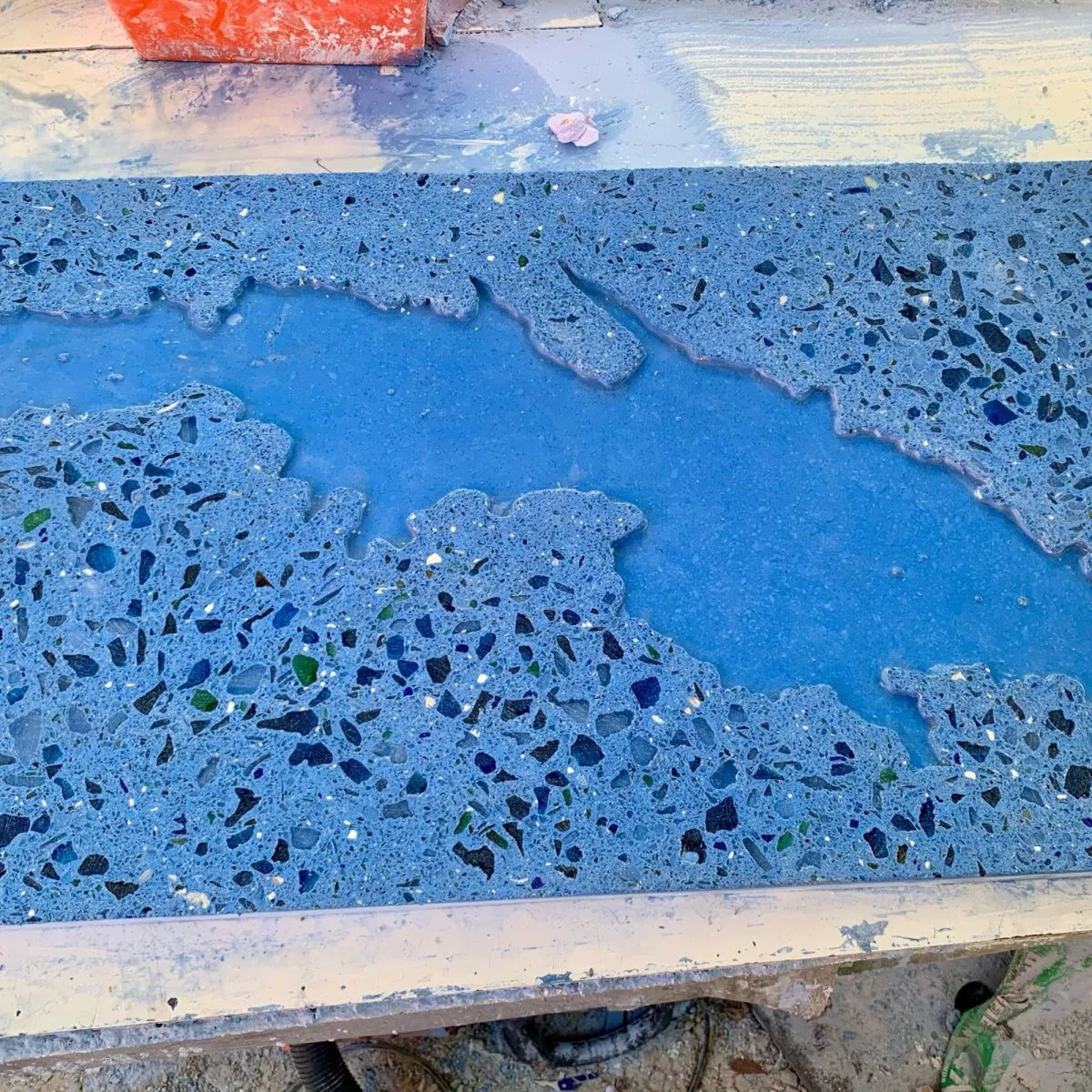 The glass used in each slab is carefully selected to create beautiful mixes inspired by the Caribbean environment. Different bottle types produce different tones and textures, resulting in unique color combinations.
